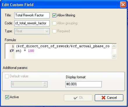 - Add the custom field “Total Rework Factor” with Type “Float” and the formula: