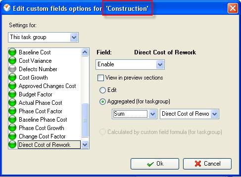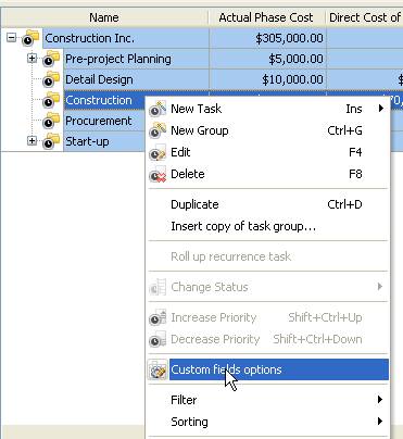 - On Task Tree select the project phase for which you need to display Total Rework Factor and select “Custom fields options”