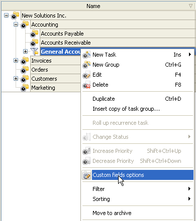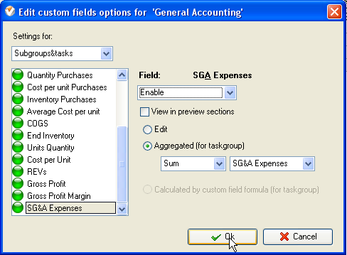 To enable the displaying of total SG&A Expenses select the root or parent task group and click "Custom fields options"