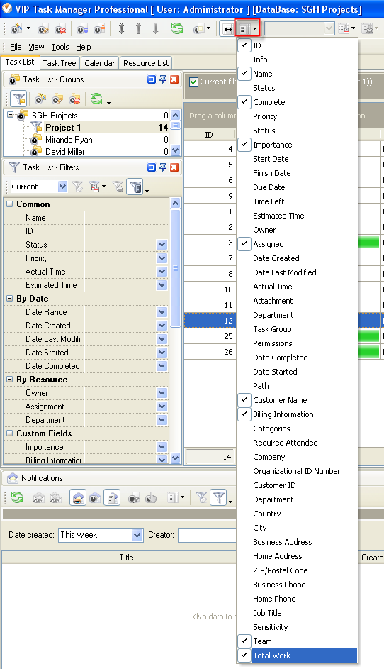 Tree, click Task List Columns or Task Tree Columns button