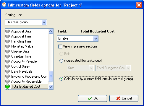 - select “Calculated by custom field formula (for task group)”