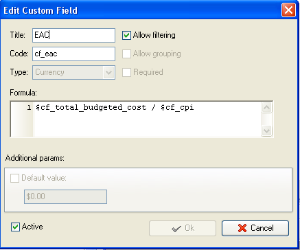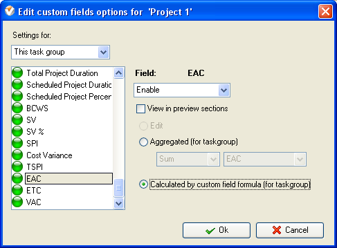 - Set the following custom fields settings for the custom fields: “Total Budgeted Cost”, “EAC” and “VAC”