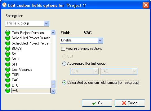 On Task Tree select the task group for which you need to display Variance at Completion (VAC) per Project and select “Custom fields options”