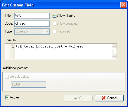 - Add the custom field “VAC” (Variance at Completion) with code “cf_vac” and the formula: