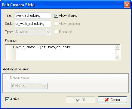 - Add custom field “Work Scheduling“ with Code “cf_work_scheduling” the formula:
