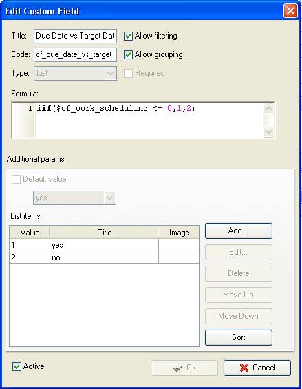If task Due Date is earlier or equal to Target Date this custom field will show “Yes”. If task Due Date is greater than Target Date, this custom field will show “No”.