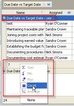 - Right click under column “Due Date vs Target Date : yes” and select “Count”