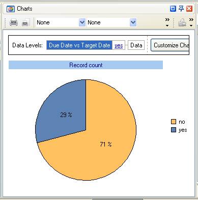 - To see the percentage of tasks with Due Date earlier or equal Target Date go to Charts panel and select Pie diagram