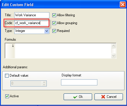 - In "Code" field enter "cf_work_variance"