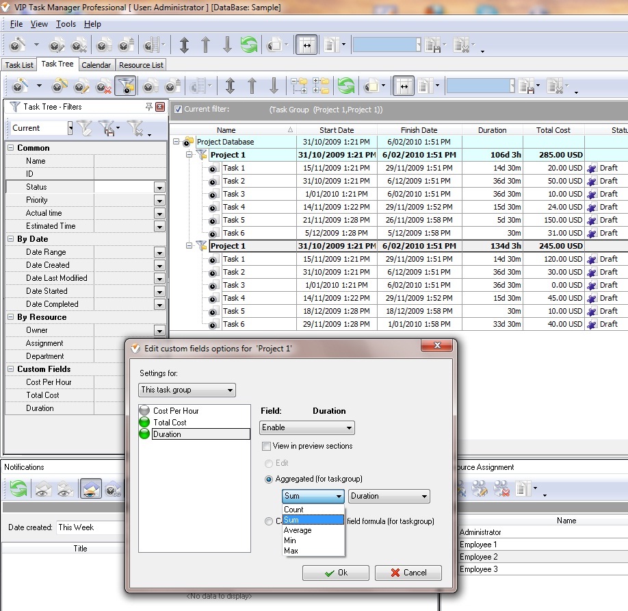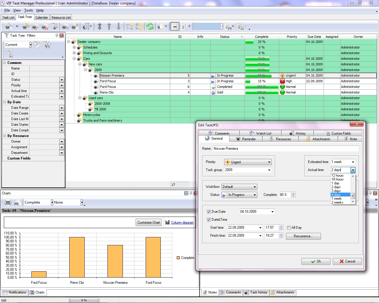 VIP Task Manager allows assigning custom fields to both tasks and folders. It provides users with standard aggregation functions and unique mathematic, statistic and logical formulas to process task data for high level planning. For example, users can plan key performance indicators for the folders and then compare actual results with estimated values. |