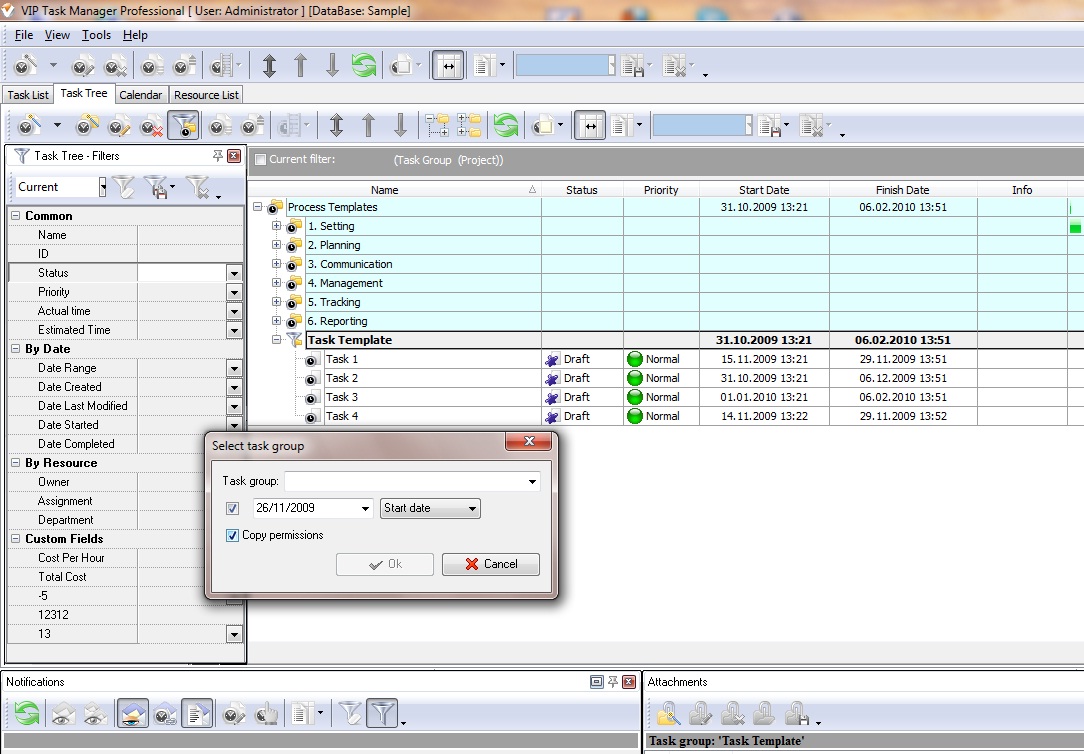 VIP Task Manager lets users plan task and folders both separately and jointly. It features Task List view and Task Group panel which display tasks and folders separately and also it has Task Tree view which shows the hierarchy of tasks and folders. Folders on Task Tree view can show total completion, total estimated and total actual time, the earliest start date and the latest finish date of tasks. |