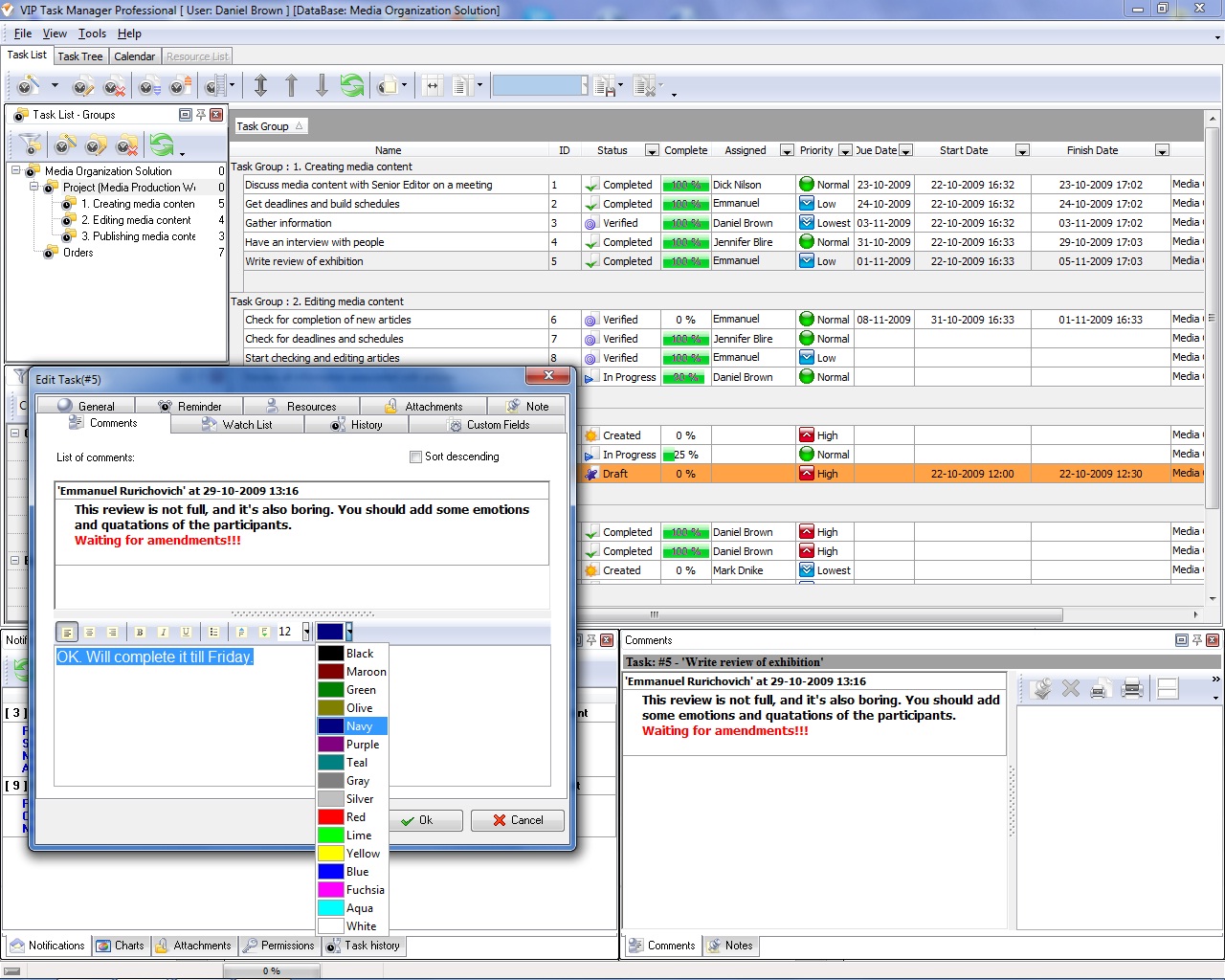 VIP Task Manager features Comments tab for commenting tasks within projects. Team members can use the tab to leave feedback and ask questions, as well as use it as a real-time chat. The software supports user collaboration in real time and exchanges task updates (including changes in Comments tab) between team members immediately after the updates have been applied. You can chat with your team members by using Comments panel – this panel lets quickly update and save new comments. The permissions management system of the software gives only permitted users the access to Comments tab/panel. Task comments can be printed out and included in reports.