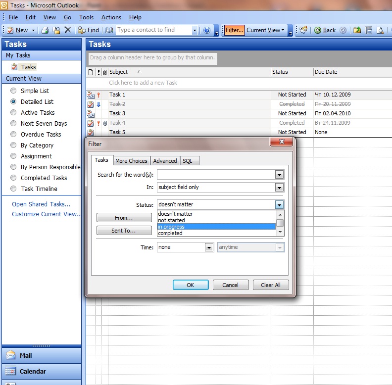 MS Outlook has Filter tool that lets search tasks by keywords and organize tasks by status, date, priority etc. You can use this tool to apply advanced options, such as SQL. But you will fail trying to filter tasks by multiple items of one and the same parameter. For example, in common task list you need to display tasks which have statuses 'Deferred' and 'In Progress'. MS Outlook allows filtering tasks by one status name only. You can try to apply filters in combination with Current View options but you still get the same problem.