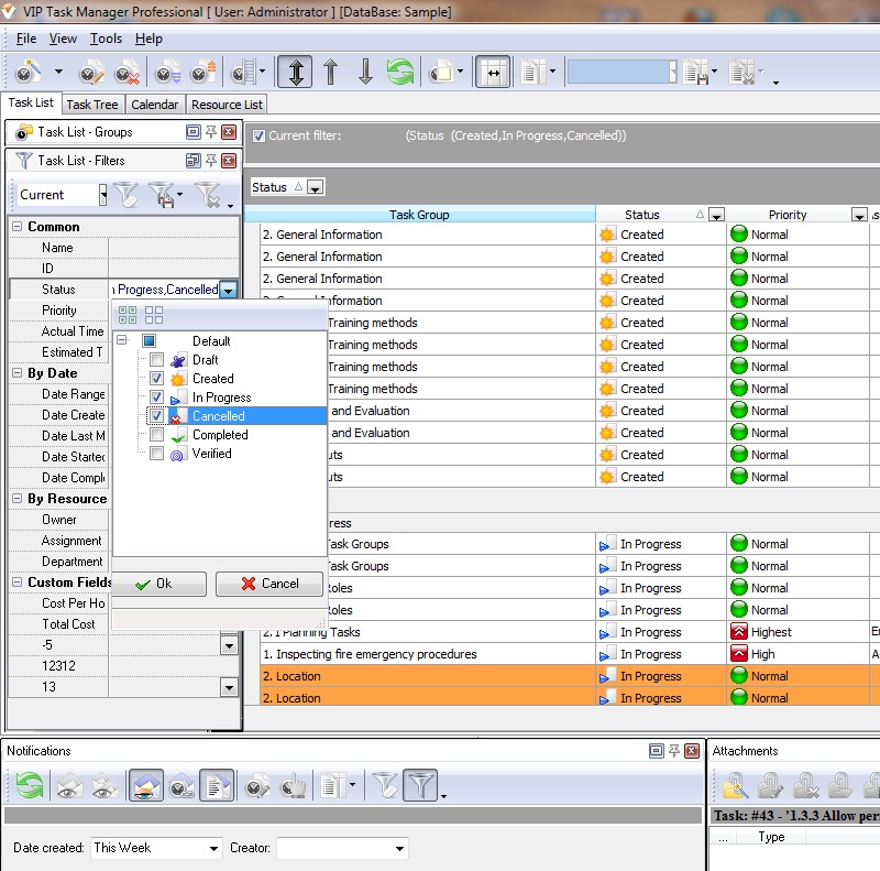 VIP Task Manager has Filter Bar that allows you choosing which items of one and the same parameter are to be included in your filter settings. Regarding the mentioned example, you can select a set of status names (In Progress, Created, Draft, or any user-defined status names) to display tasks that have different statuses but which you want to get displayed in common task list. You can choose multiple names of any task field and save current filter settings to a profile, so next time you can upload the same filter settings. In addition, you can use filters to customize view of your reports as VIP Task Manager allows exporting current task list view to HTML files and creating reports in text format. |