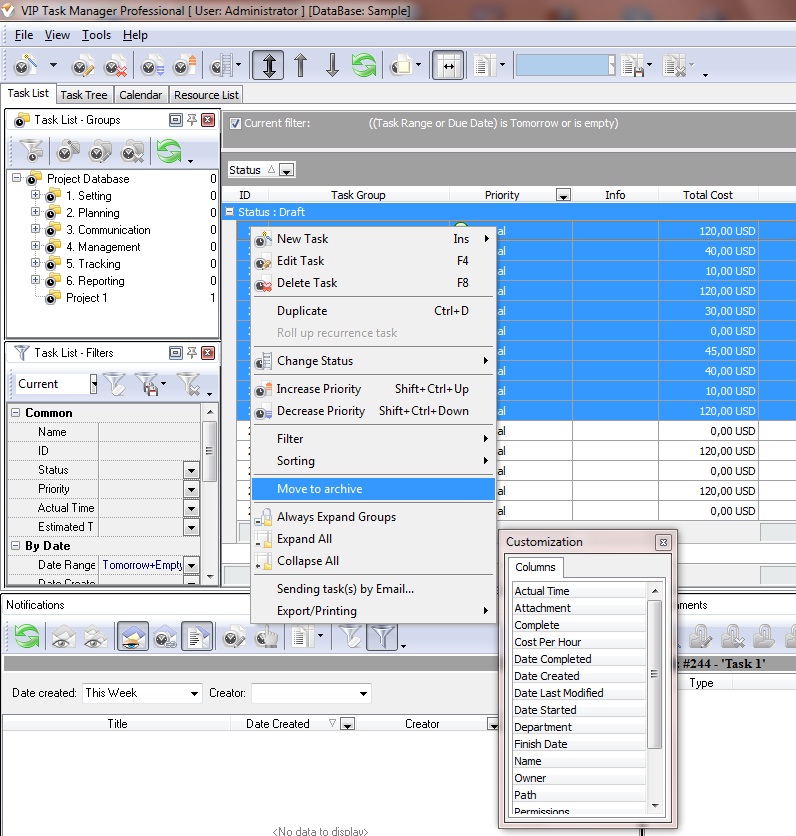 VIP Task Manager allows moving separate tasks, lists of tasks and task groups to archive any time, so you can better organize your to-do lists, keep them always up-to-date, hide completed tasks and keep pending tasks on track. Achieve mode of VIP Task Manager allows filtering, sorting, printing and reporting achieved tasks and task groups. Task achieving functionality of the software acts in accordance with user permissions, so only permitted users can move/restore tasks to/from archive. |