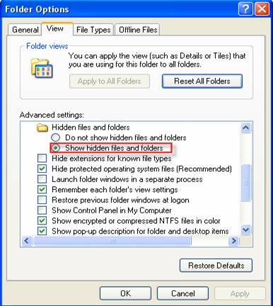 - Go to: Start -> Settings -> Control Panel ->Folder Options and open 'View' tab