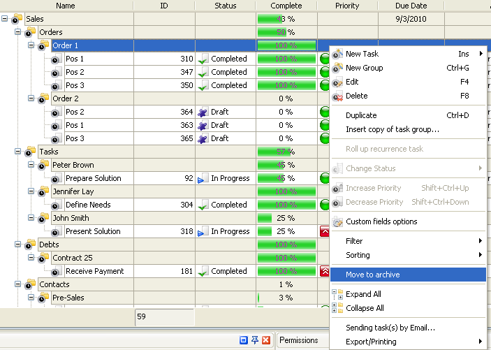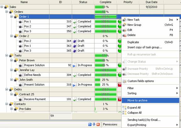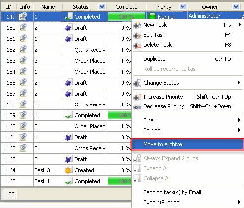 - To move task group along with completed tasks to archive, go to Task Tree view or “Task List-Groups” on Task List view, select task group, right click and select the option “Move to archive”.