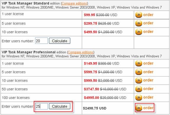 2. In 'Enter user number' field for required edition of VIP Task Manager: Professional or Standard enter the required number of licenses you need and click “Calculate” and “Order”