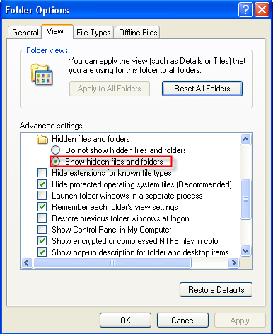- Select radio button "Show hidden files and folders"
