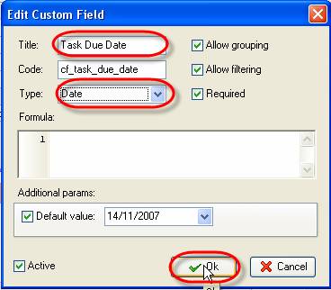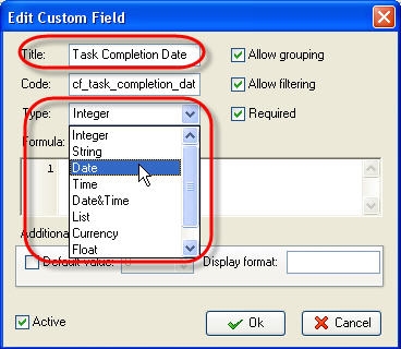 - Enter ‘Task Completion Date' into ‘Title' entry field, select ‘Date' type from ‘Type' drop-down list and click 'Ok'