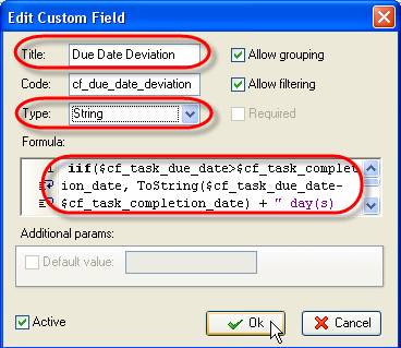 - Create a new custom field ‘Due Date Deviation' that has ‘String' type and enter following formula into ‘Formula' field: