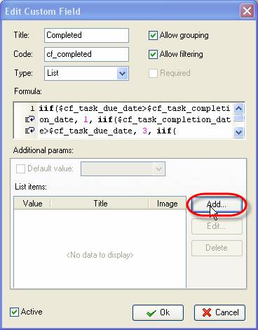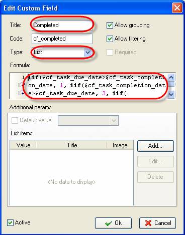 - Create a new custom field ‘Completed' that has ‘List' type and enter following formula into ‘Formula' field: