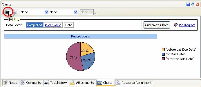 - Go to ‘Charts' panel, select 'Pie diagram' and click on ‘Print' button on Charts toolbar to print out task percentage tasks completed early/late/on time