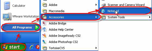 - Go to Start -> All programs -> Accessories -> Notepad