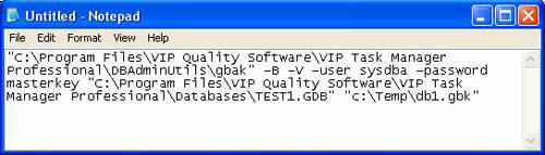 "C:\Program Files\VIP Quality Software\VIP Task Manager Professional\DBAdminUtils\gbak" -B -V -user sysdba -password masterkey "C:\Program Files\VIP Quality Software\VIP Task Manager Professional\Databases\TEST1.GDB" "c:\Temp\db1.gbk"