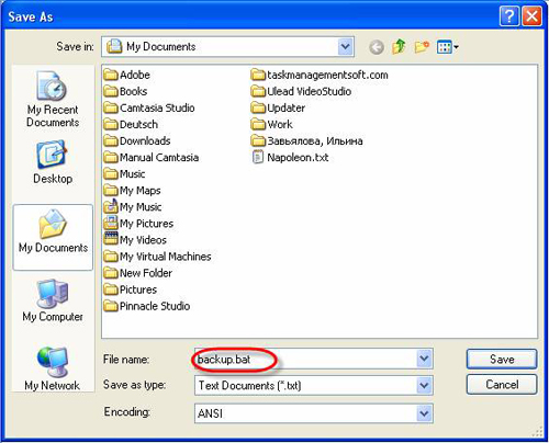 - Go to main menu command [File -> Save As], select the path for this file, enter file name with .bat extension, for example backup.bat, click on ‘Save’ button and close the file.