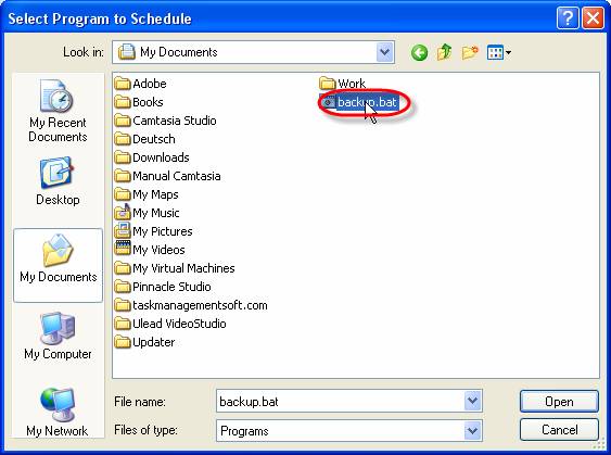 Select your .bat file (in our example backup.bat) and click on ‘Open’ button