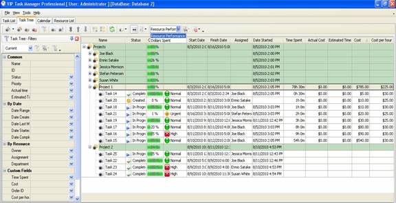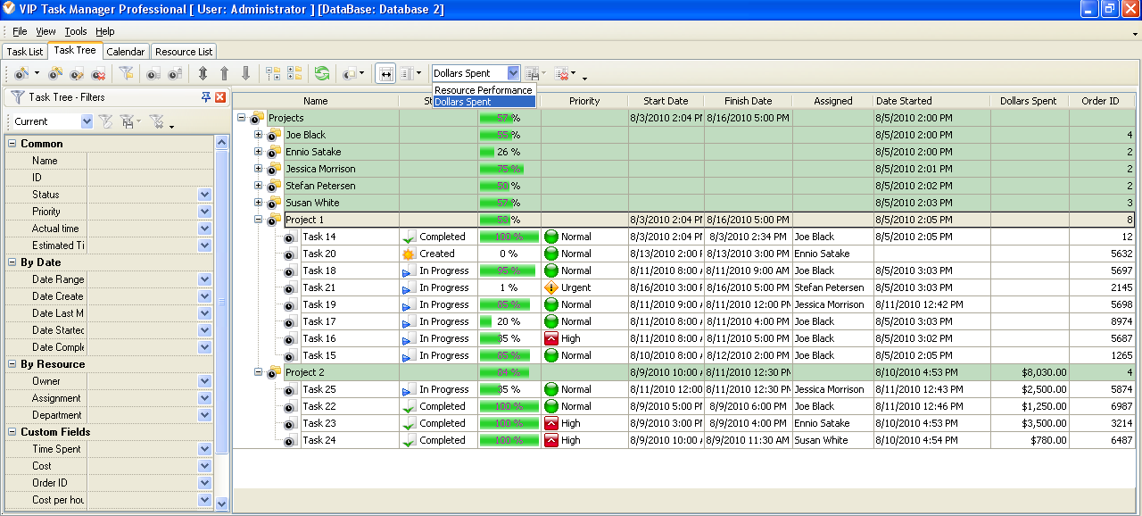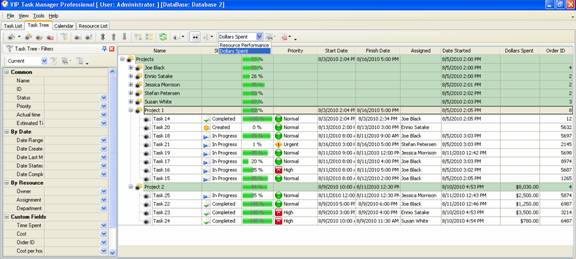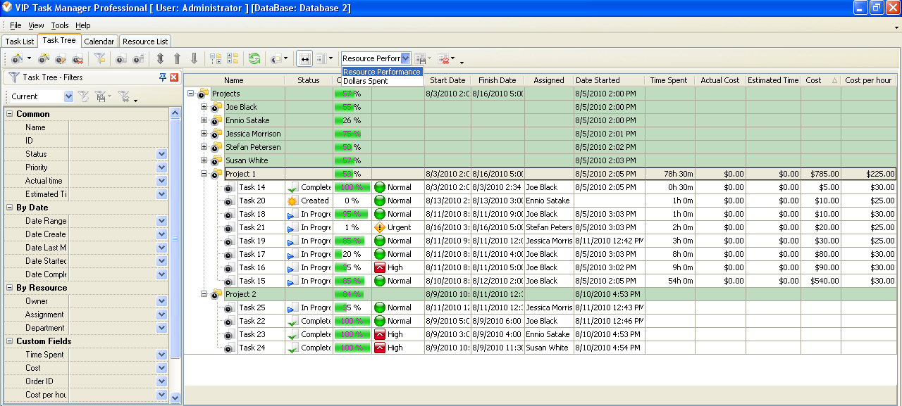 - Create custom layouts, for example, “Resource Performance” or “Time Spent” for Project 1 and “Dollars Spent” for Project 2