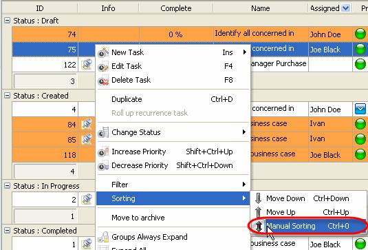 - Click on ‘Manual Sorting’ button on Task List or Task Tree toolbar or right click on Task List or Task Tree grid and select ‘Manual Sorting’ from drop-down list