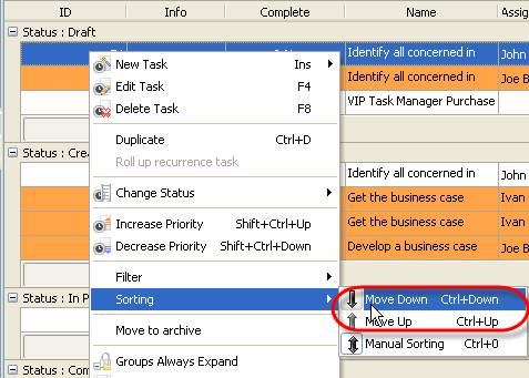- Click ‘Move Up’/’Move Down’ buttons on Task List or Task Tree toolbar or right click on Task List or Task Tree grid and select these commands from drop-down list
