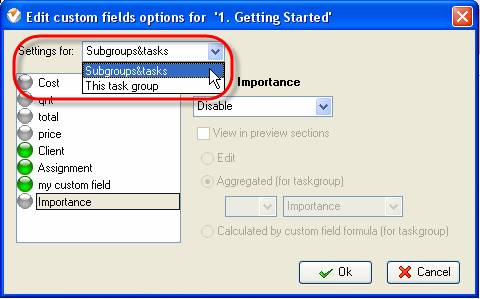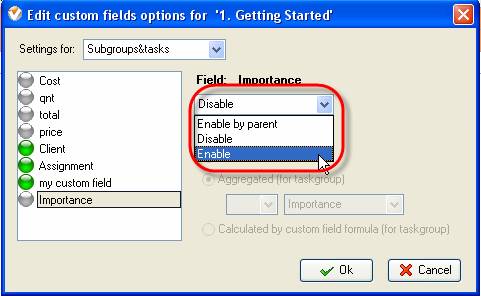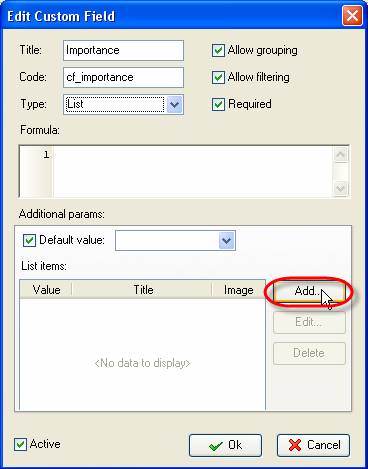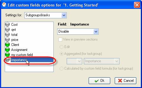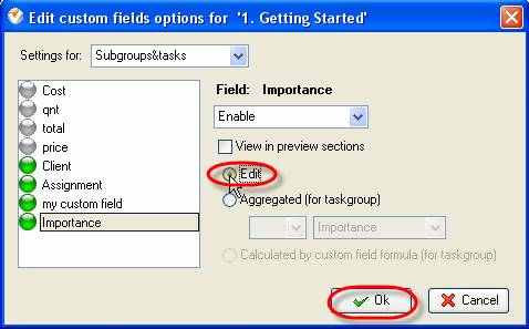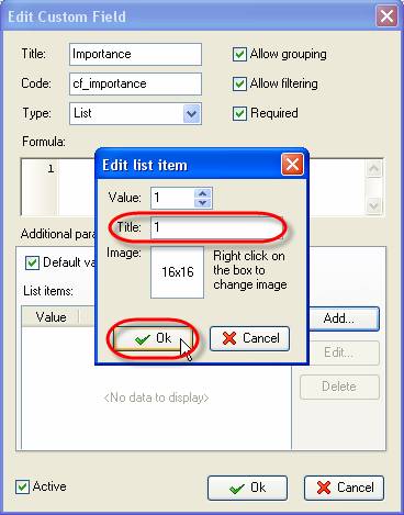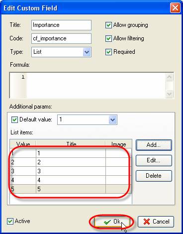 - In the same way create as many list items as you need to rank the importance of your tasks. Click ‘Ok’ button in ‘Edit Custom Field’ window