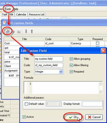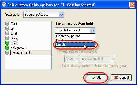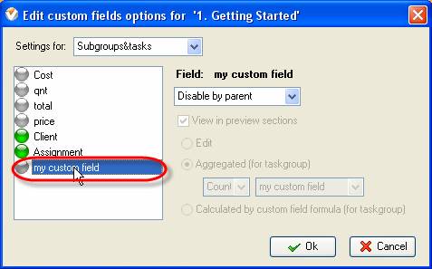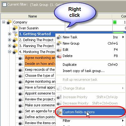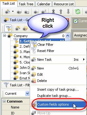 Right click on required task group on Groups panel of Task List or Calendar view or Task Tree grid and select ‘Custom fields options’ from appeared drop-down list. If you want custom fields to be visible in a New Task dialog of all the tasks of your database, right click on the top task group.